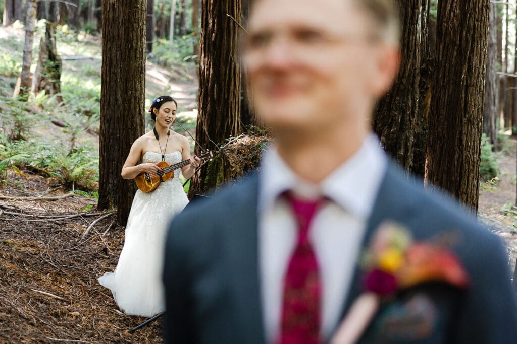 Before the ceremony, Shannon and Alan shared a first look under the redwoods. No posing for the perfect photo — just a quiet, emotional exchange between two people about to say “yes” in front of everyone they care about.