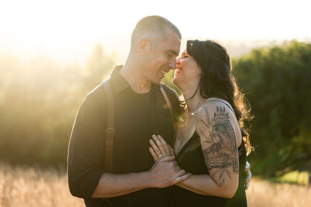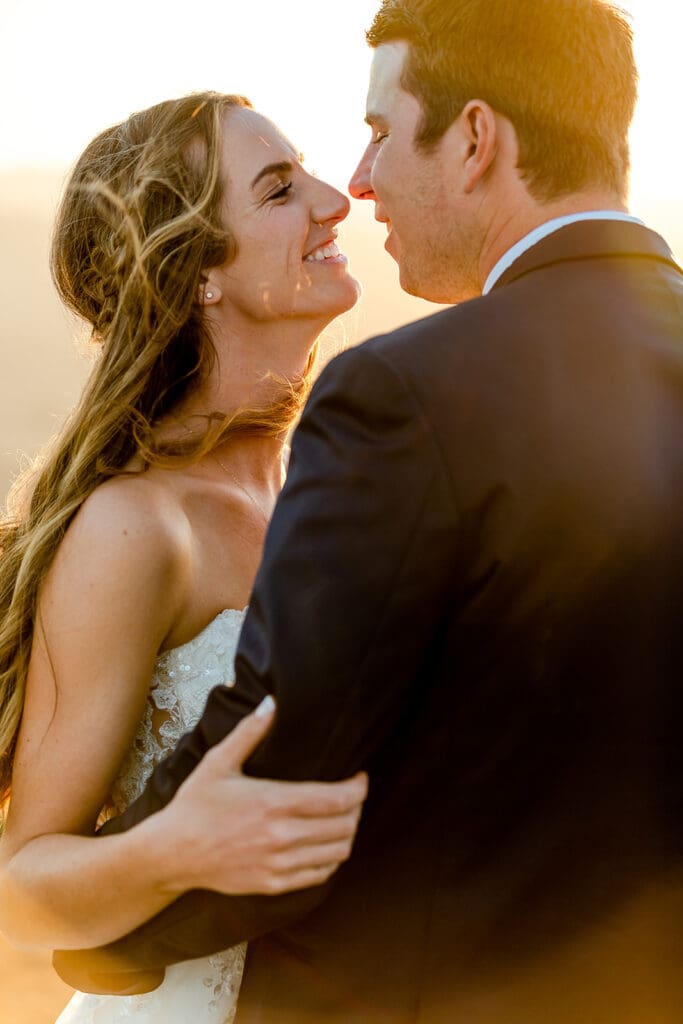 Petaluma Wedding couple embraces in golden hour with farm backdrop