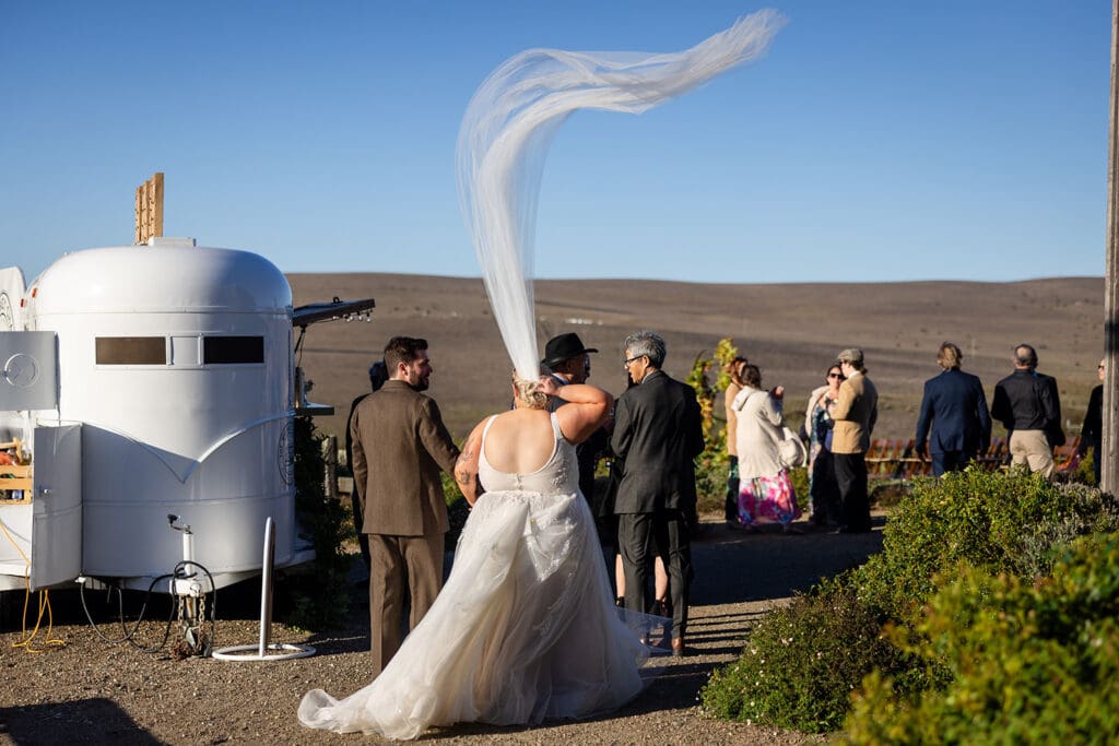 A gust of wind blows wedding guest's hair at Petaluma Wedding.
